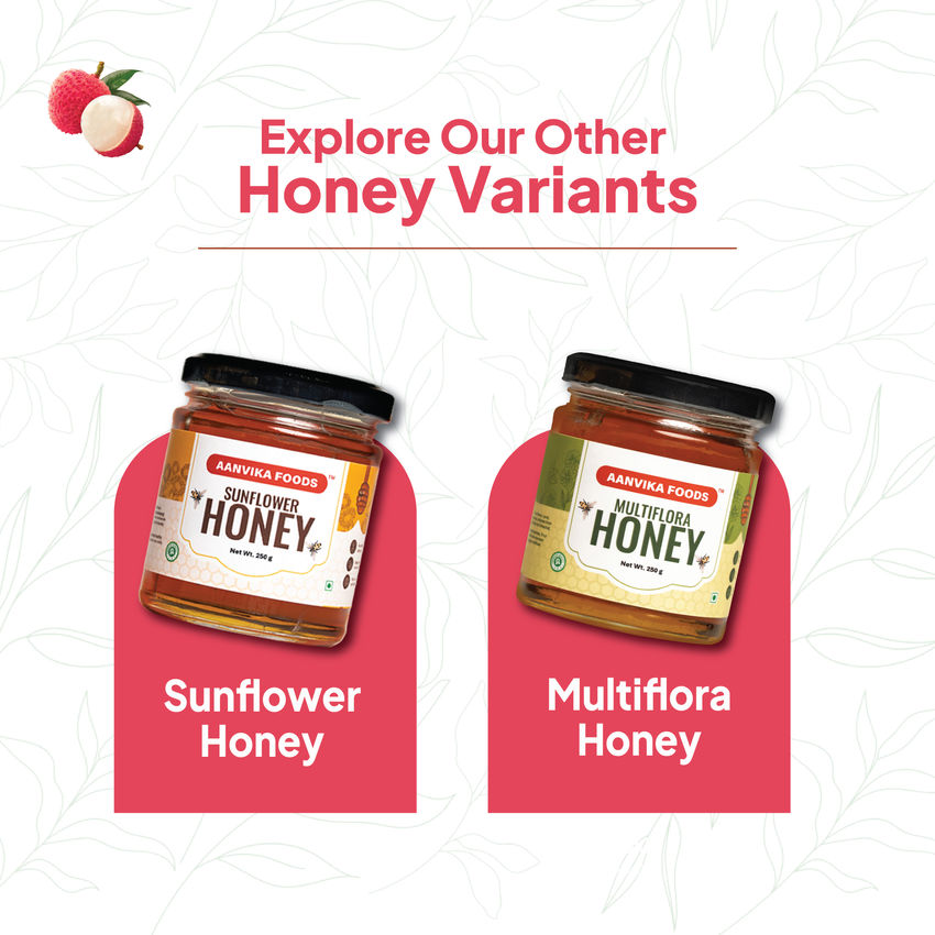 Each batch is ethically harvested, quality-checked, and bottled with utmost care to preserve nature’s purity and goodness. Aanvika Lychee Honey brings the taste of real honey with a refreshing twist—ideal for gifting, wellness routines, and healthy living.